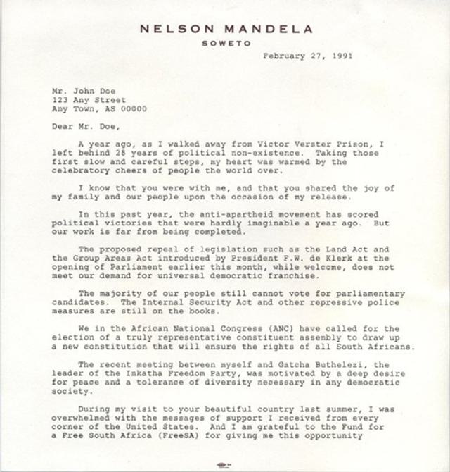 This was one of the first, perhaps the very first, fundraising letters to be signed by Nelson Mandela following his release from prison in 1990. It sparked a successful ongoing campaign that mobilised significant donor support within the United States for the historic anti-apartheid campaign.