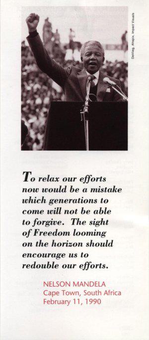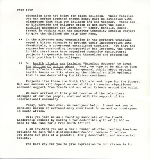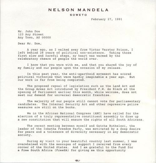 Ce publipostage était parmi les premiers lettres, ou peut-être c'était le premier, pour la collecte de fonds d'être signés par Nelson Mandela suivant sa sortie de prison en 1990. Elle a suscité une campagne continuelle qui a mobilisé des donateurs des Etats-Unis de soutenir considérablement la campagne anti-apartheid.