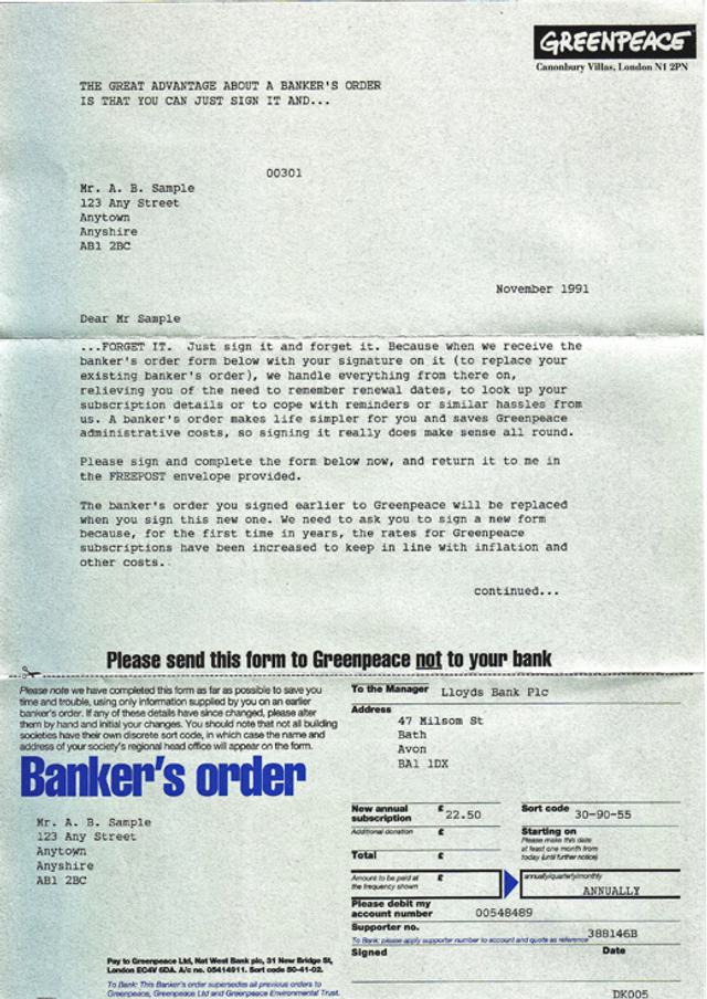 Greenpeace UK at the time had a large but very flat supporter base, most people were just paying an annual subscription fee of £15.00, which was all they had ever been asked for. This was before the launch of Greenpeace’s high value monthly giving scheme, Frontline. Renewal was seen as a key annual activity, with particular emphasis on trying to get supporters to sign banker’s orders (as in this example) or, later, direct debits. It was felt that after this inertia would work in Greenpeace’s favour rather than against it, which was happening with the cash donation system that was prevalent at the time.