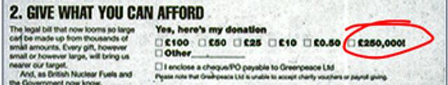 It seemed a zany idea, but a characteristically cheeky approach from Greenpeace. And it worked, because one donor did give £200,000. We’re still not quite sure why he didn’t give the full quarter of a £million. Mean, I guess.