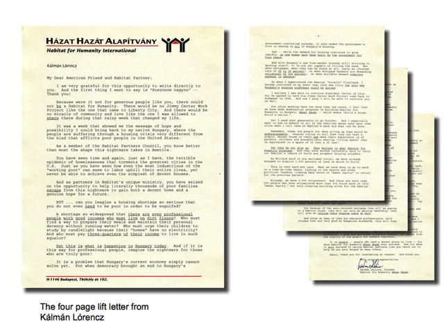 Kalman Lorincz, an American Hungarian, turned up in a driving rainstorm to offer to work at the 1991 Jimmy Carter Work Project in Miami, Florida. During the week he became inspired to start his own project in his native Hungary and approached Habitat International for help in fulfilling his dream.