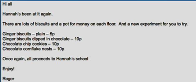 Emboldened by the success of her first fundraising direct mail appeal (Hannah’s innovative direct mail appeal), talented nine-year old fundraiser Hannah is this time raising money for her school’s funds by baking cakes. Cunningly, she then gets her father to sell her quality produce to his work colleagues. Sales are booming, perhaps because she knows that, as dad is one of the bosses at his firm, so the poor employees have little choice. But Hannah’s baking is delicious and buyers are queuing up for more. Sound fundraising best practice we feel, Hannah. Well done.