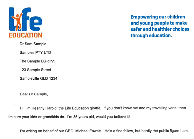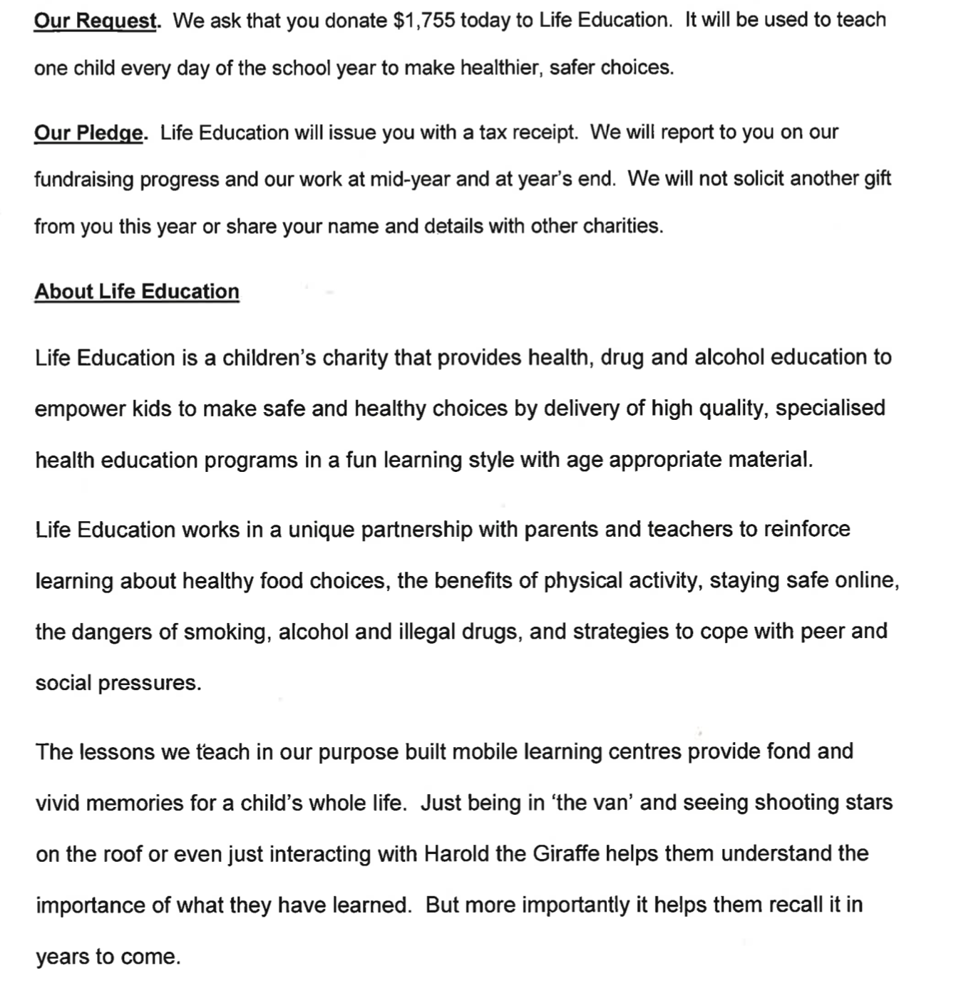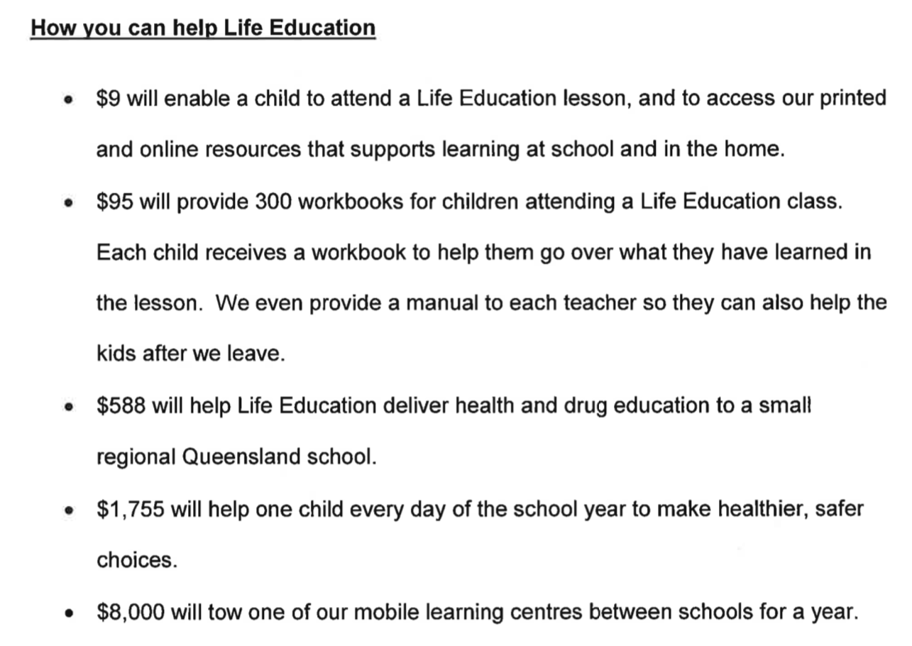 The proposal sent to prospective donors was simple – you might even argue crude – but hugely effective. Simple bullet points outlined Life Education’s mission, objectives and how donors could make a difference in the lives of young people.