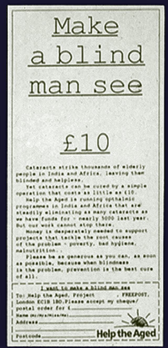Diese Anzeige ist ein Klassiker. Sie wurde in den späten Siebzigern von Harold Sumption entworfen. Sie verkörpert einen der direktesten und kaum zu widerstehenden Spendenaufrufe: „Schenken Sie einem Blinden Augenlicht“. Auf einen Blick sieht man, wie viel dieses Wunder kostet, € 10, ein Preis, den sich jeder leisten kann.