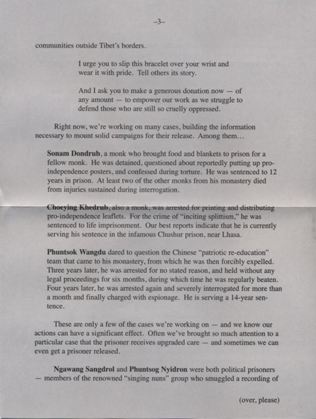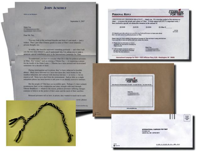 This appeal is emblematic of the dramatic international effort underway to support the people of Tibet. Its successful use of a 'freedom bracelet', a distinctive front-end premium, demonstrates the art of direct mail fundraising at its best.