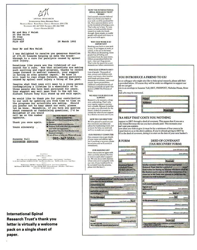 ISRT (International Spinal Research Trust) produced this ‘first response’ welcome and thank-you letter at a time when complex welcome packages were becoming increasingly fashionable in the UK. As a small and not well-funded organisation, the charity wanted to produce something that was very low cost yet which thanked donors appropriately and introduced and explained the organisation. Plus, it set out to outline compellingly what support from donors means so that, hopefully, recipients would keep on supporting. In effect, ISRT produced a ‘welcome pack on a single page’. This low cost example of donor relationship development shows fundraising creativity at its simplest and best. Every fundraising organisation could and should aspire to have a thank-you programme and materials at least as good as this.