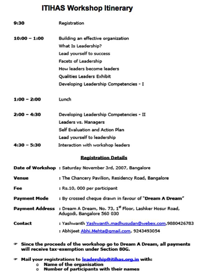ITIHAS organised a leadership workshop in 2006 as a fundraising activity in aid of Dream A Dream, a professional NGO working to empower children from vulnerable backgrounds (see related pages, below, for associated Dream A Dream exhibits). The leadership workshop was a daylong event focused on key decision makers from leading multinational corporations in Bangalore.