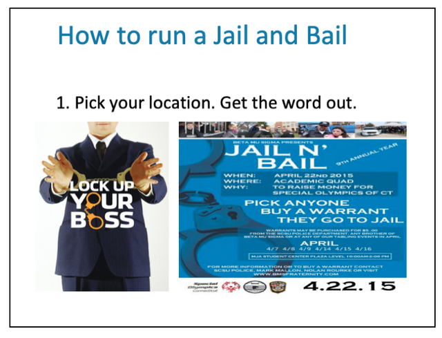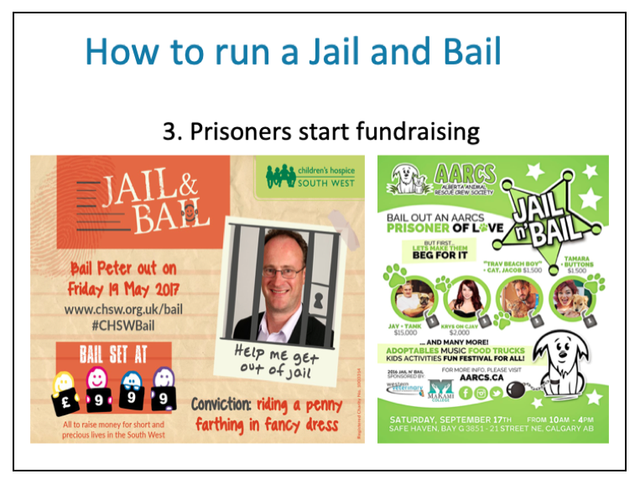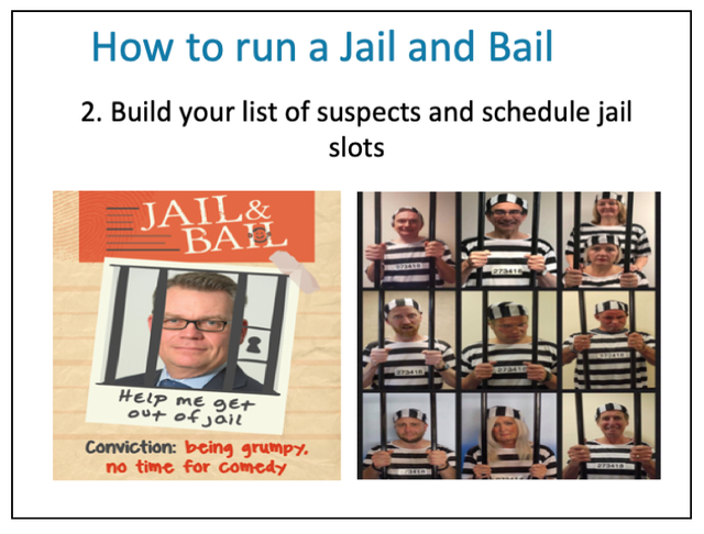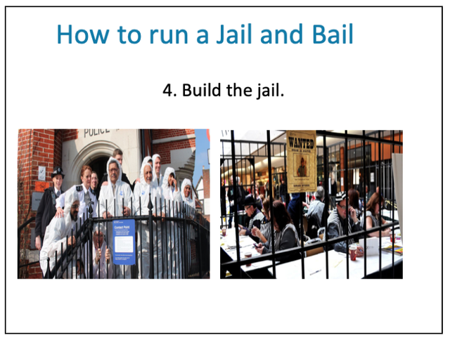 Then get the word out. Back in the early 1990s there was no such thing as social media. But now you can set up a Jail and Bail Facebook page or digital giving page. Spread the word, ask people to nominate their bosses or colleagues for arrest and incarceration for an hour, a morning or a day, raising bail from friends to be released.