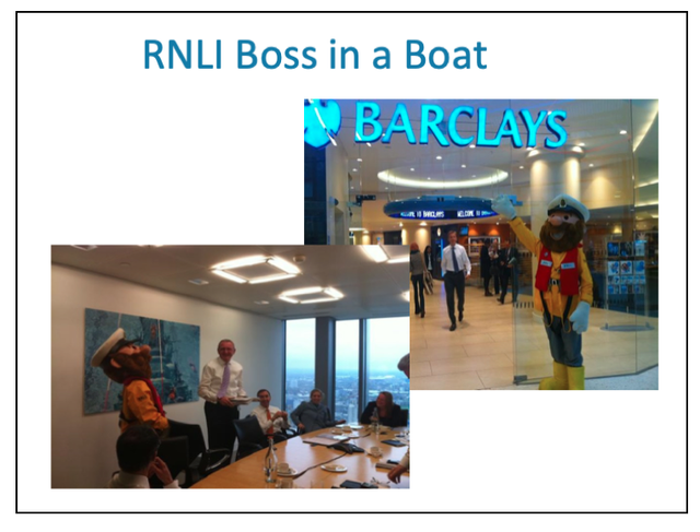 This is an example of the RNLI’s version of a Jail and Bail. ‘Boss in a Boat’ took place in Canary Wharf. The prisoners were senior finance sector professionals. They were arrested by the RNLI mascot, Stormy Stan and taken to an inshore lifeboat moored nearby.