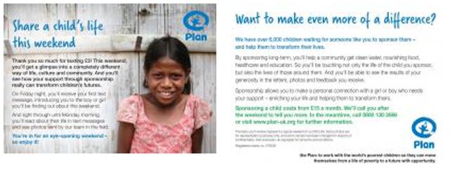 Questa iniziativa di Plan UK sembra essere la prima in cui il donatore può, per così dire, “saggiare il prodotto” e sperimentare cosa significa adottare a distanza tramite l’uso del cellulare e di internet.