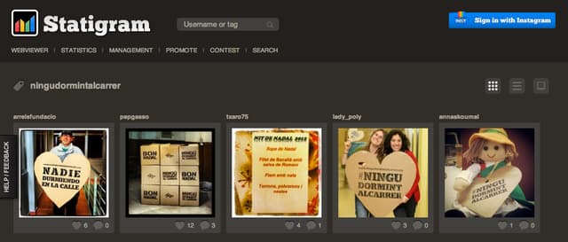 Tutta la campagna natalizia del 2012 è stata sviluppata intorno ad un tema ricorrente: un cuore di cartone con il seguente messaggio #nigudormintalcarrer (nessuno dorma per la strada). Questo slogan rimandava all’azione vera e propria del dormire per la strada, ed alludeva inoltre a fatto che anche i senzatetto hanno un cuore. Attraverso l’uso dell’hashtag #nigudormintalcarrer (nessuno dorma per la strada) nel design del logo, la campagna ha funzionato sia online che offline. La campagna online è diventata facilmente virale: partendo dal minisitowww.nobodysleepingonthestreet.org, si è poi diffusa attraverso i social network, su Twitter e Instagram grazie all’hashtag, e su Facebook attraverso i tag e la possibilità di associare il cuore simbolo della campagna al proprio profilo personale.
