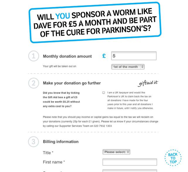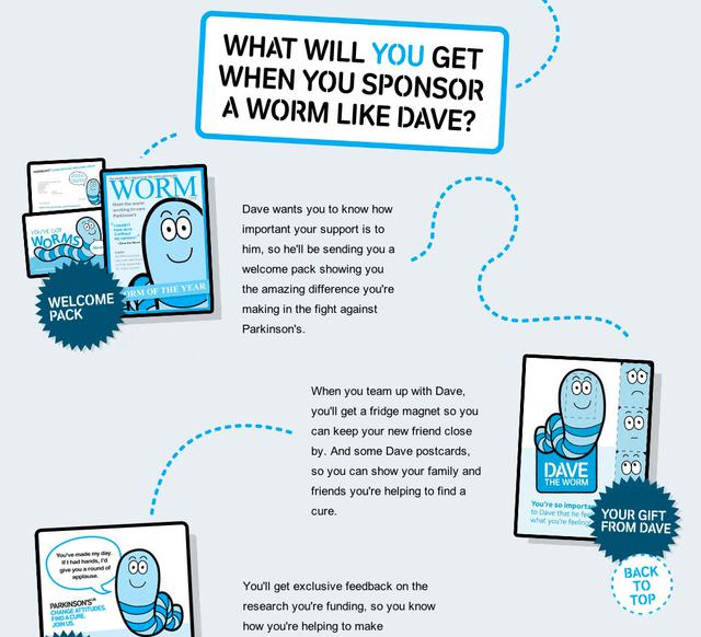 La maggior parte dei fundraiser concorda sul fatto che il sostegno regolare è il miglior strumento di raccolta fondi. Le organizzazioni in grado di offrire un buon progetto di sostegno regolare, ottengono infatti sempre ottimi risultati. Il donatore può attivare un sostegno regolare per adottare un bambino, un cane, una stanza e persino uno scarafaggio. Ed ora, grazie all’associazione Parkinson inglese, i donatori possono adottare anche un verme. Leggi qui sotto per scoprire chi è Dave il Verme e perché la ricerca sul Parkinson è così importante.