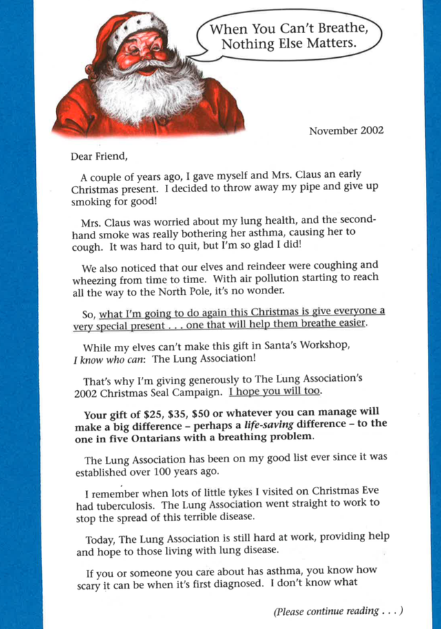 So naturally, Santa had started giving to The Lung Association, because it was one gift he couldn't count on his elves making in their workshop. And when he asked the donor to show their support too, he gave them an option to give whatever they could manage. Of course, nobody wants to get on Santa's naughty list, so really it's an ask few people would dare to refuse.