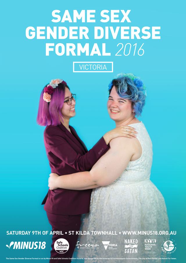 The Same Sex Gender Diverse Formal is run by Minus18 and Safe Schools Coalition Victoria and supported by the Victorian Government in Melbourne, Australia. It gives a safe space for teenagers who don’t identify as straight. Those in attendance can dress however they want, act however they want and bring whomever they want.