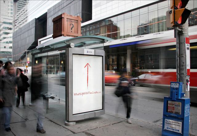 A bus shelter poster underneath each crate drove traffic to a unique URL link called ‘Whatsupwiththecrate.ca’. This site had a daily updated blog where the crate told the story of its life as a lonely, lost box looking for a purpose. The idea was to encourage people to find a meaning for the crate’s existence.