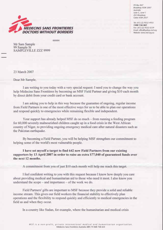 Without doubt all fundraisers want regular givers and lots of them. The best place to start is with your existing supporters and a well-phrased, powerfully argued request to convert from random one-off gifts to planned regular giving, hopefully by direct electronic funds transfer. MSF’s creation of ‘field partners’ was very successful at this.