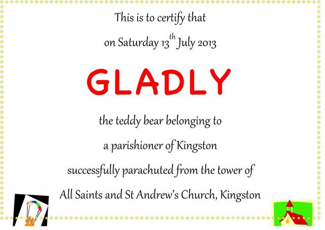 Down below children happily made and decorated parachutes for their teddies (and other cuddly toys) from a simple DIY kit provided by the vicar, the Reverend Alexandra Clarke. At the end of the afternoon many of the residents gathered in the churchyard to watch the parachuting descent of each teddy, whose name and owner’s name was announced before launching. Each teddy received a personalised certificate to commemorate its jump and everyone had great fun, especially those parishioners who are not normally part of the congregation. No charge was made to climb the tower or the parachutes, but donations were encouraged as part of the traditional gift day.