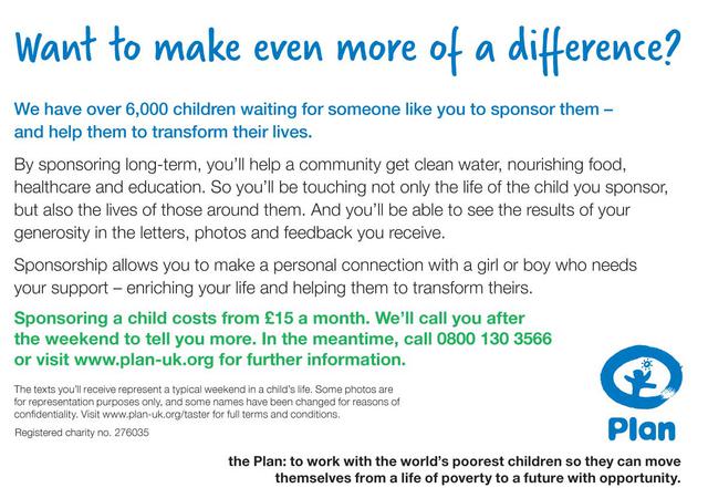 We recruited prospects via press and on the street. After their weekend of sponsorship, they were called to ask them to convert to full child sponsorship via direct debit.