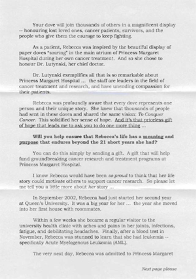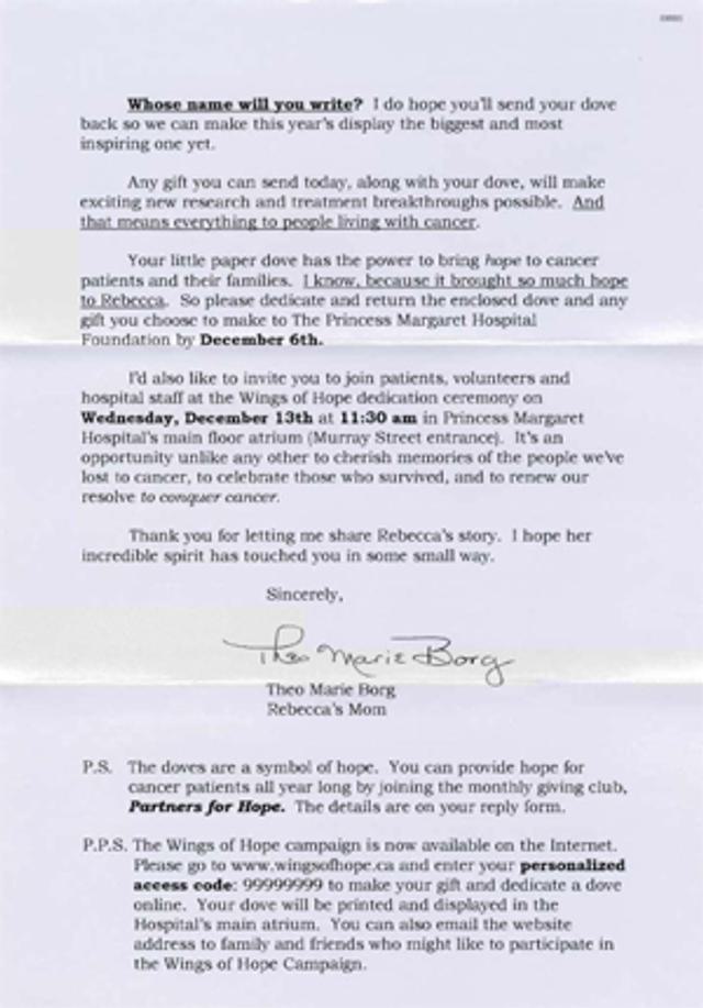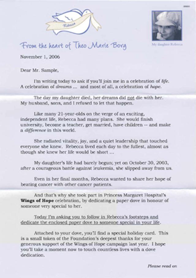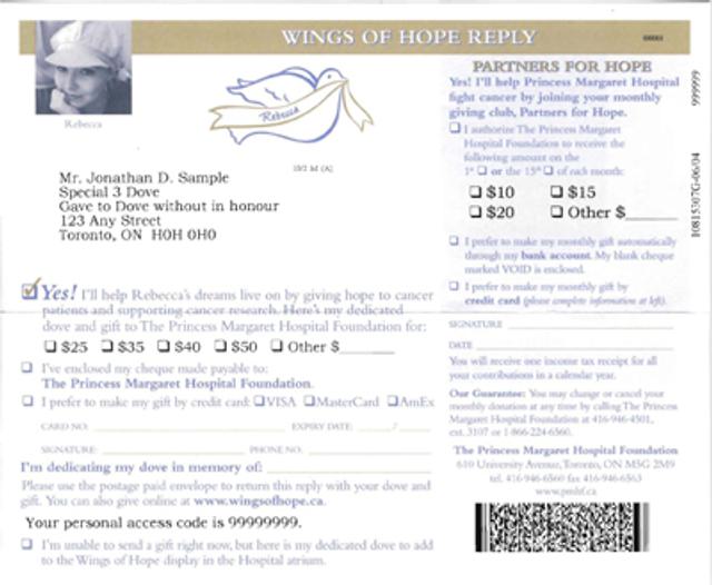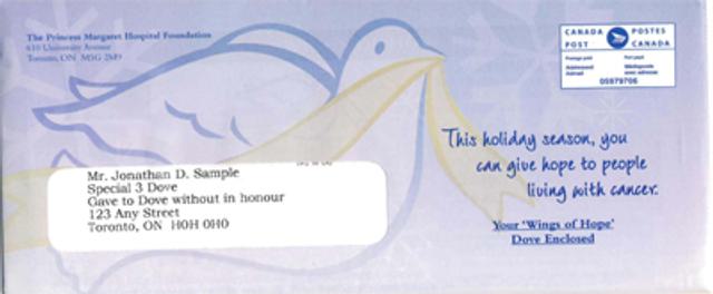 First mailed in November 2001, the ‘Wings of Hope’ is now a tradition at Princess Margaret Hospital – one of the world’s top five cancer research hospitals, located in Toronto, Ontario, Canada. This appeal is mailed as a year-end special appeal to house (warm) donors, as well as prospects (hospital ex-patients, addressed rental lists and unaddressed households throughout the Greater Toronto Area).