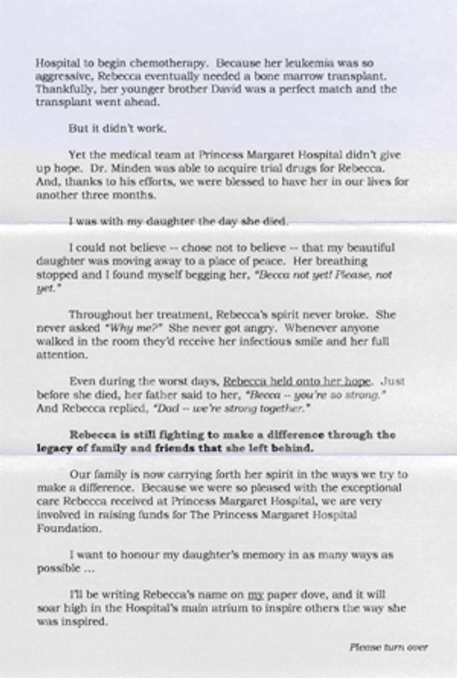 The 2006 letter was signed by a mother who lost her 21-year-old daughter to leukemia. It is an emotional and heart-wrenching story as well as a celebration of life and of hope, and it fits perfectly within the overall campaign theme. The 2005 appeal featured a story of cancer survival. Along with the client, we agreed that a more emotional letter of loss and remembrance could potentially inspire additional donors to give.