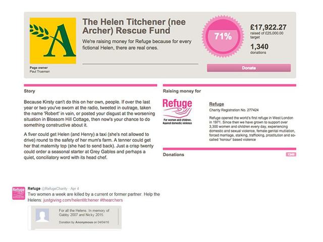 An individual fundraiser created an online fundraising page for a fictional character in The Archers who was suffering from domestic abuse with all the money raised being donated to the charity Refuge because ‘for every fictional Helen, there are real ones’. The page reached £3,000 in just 18 hours and by April 2016 had raised £100,000.