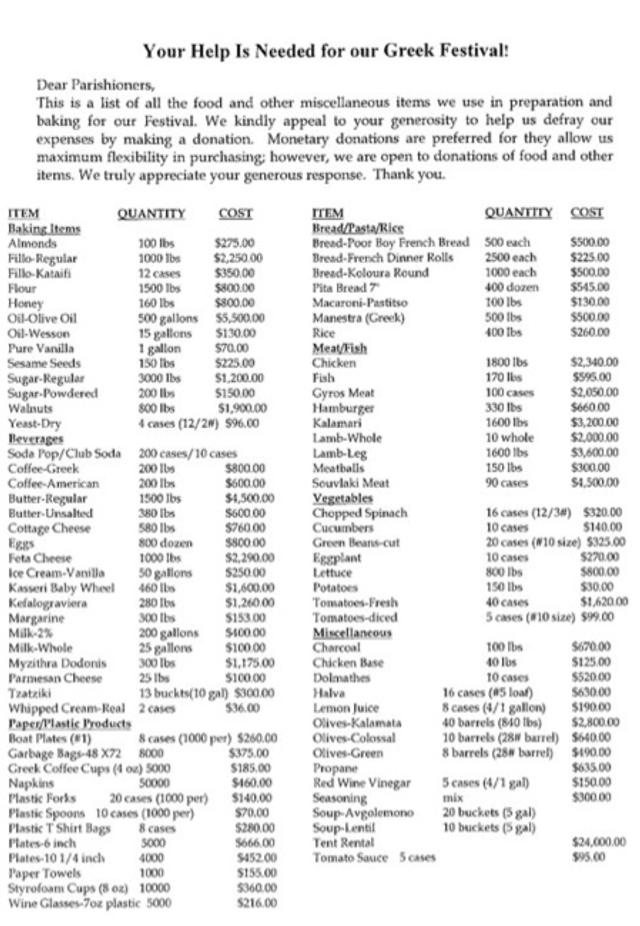To raise enough money to provide the wide range of activities and delicious food available at the annual Greek festival. Parishioners can also donate non-monetary items if they prefer.