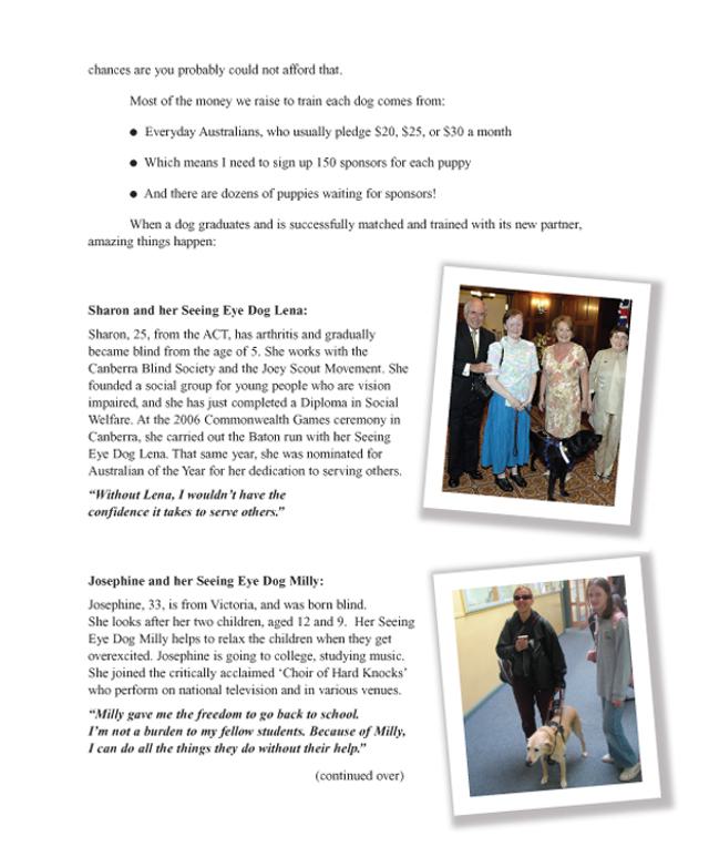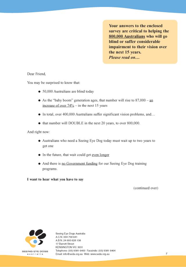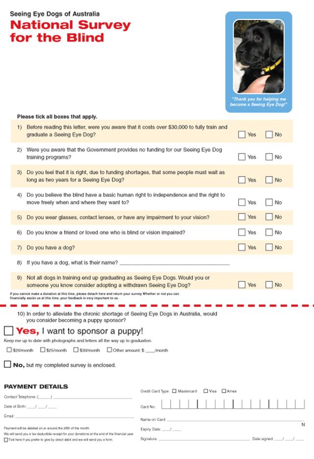 Sponsor-a-dog monthly giving schemes are not new but still remain a perennial favourite with donors. This classic direct mail appeal is worthy of attention because of the creative use of the simple questionnaire as an involvement device; and the way that the proposition has been cleverly tailored to appeal to its Australian audience. Focusing on cuddly puppies being trained as guide dogs is a cunning finishing touch and, of course, entirely appropriate for this charity. See also comments in the 'merits' section, below.