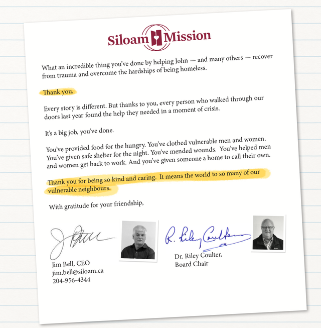 It's always wonderful to see an organisation sending a ‘love letter' to their supporters. This gratitude report from Siloam Mission shows the value of keeping donors informed of the good they do by supporting your organisation. Thanks to the courage and openness of a beneficiary named John, Siloam Mission were able to share his story and how they made a real difference to his life — all thanks to the generosity of their supporters.