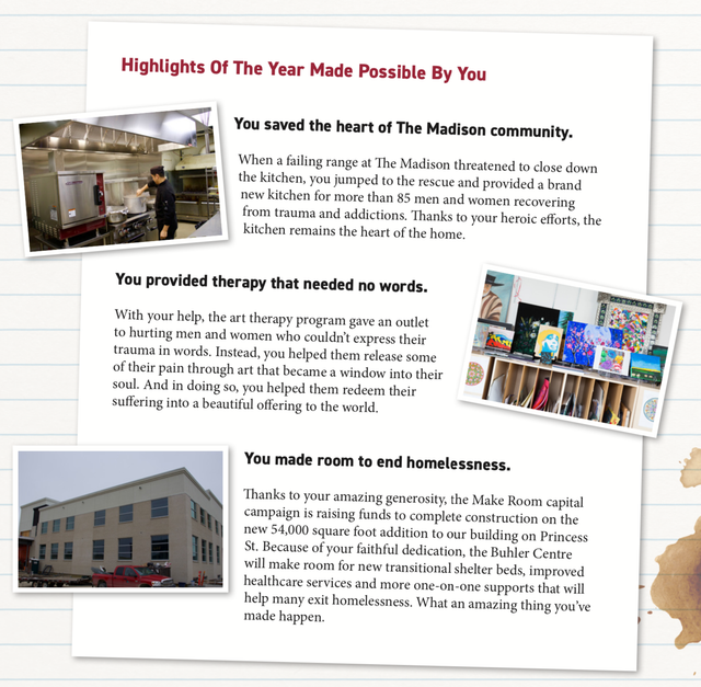The gratitude report was a big success with both donors and the organisation's internal audience of staff and volunteers. While not intended to be a fundraising piece, Siloam Mission included a reply envelope when sending it out. It raised 30 per cent more than the previous year.