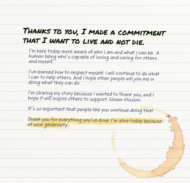 Because of privacy concerns, it can sometimes be hard to connect the donors directly with the people they are helping. But when John, a former client of Siloam Mission, courageously offered to share his story, we created a gratitude report. It was written in the style of a journal, directly addressing the people who helped him overcome homelessness.