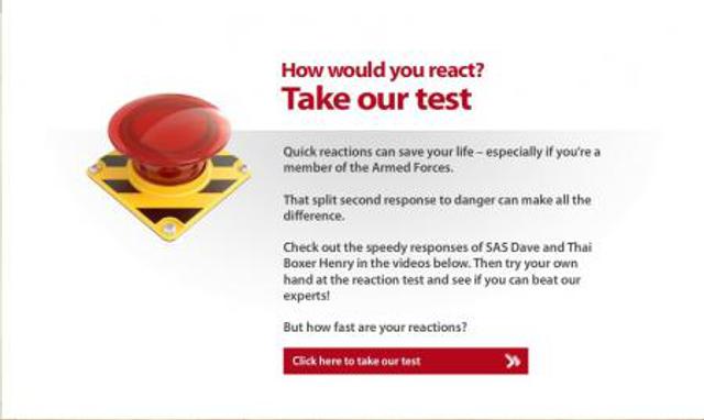 The campaign encourages people to take a grit 'reaction test'. This highlights one of the difficulties soldiers face in an explosion, where grit travels faster than the ability to blink. Henry Cleminson, European kickboxing champion, and a former special forces officer, 'SAS Dave', have already been filmed taking the test and are challenging others to beat them. The grit 'reaction test' also provides the opportunity to reach new audiences and to go viral. Messages are also being left via Facebook with people who tend to require quick reactions – e.g. boxers, sportspeople, martial artists – encouraging them to try the test (and to beat those who have already taken it).