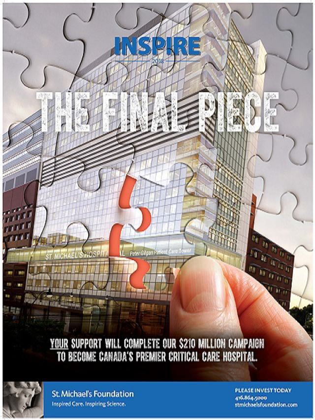 The Final Piece campaign – which debuted across the hospital in January 2016 – publicised the urgency and importance of raising the remaining funds that were needed to reach our ambitious Inspire 2018 goal. It began as a poster campaign that would be seen by both the public and hospital staff. But as the campaign gained momentum, St Michael’s Hospital Foundation expanded promotions to encourage staff to give a gift and spread the word to their family and friends too.