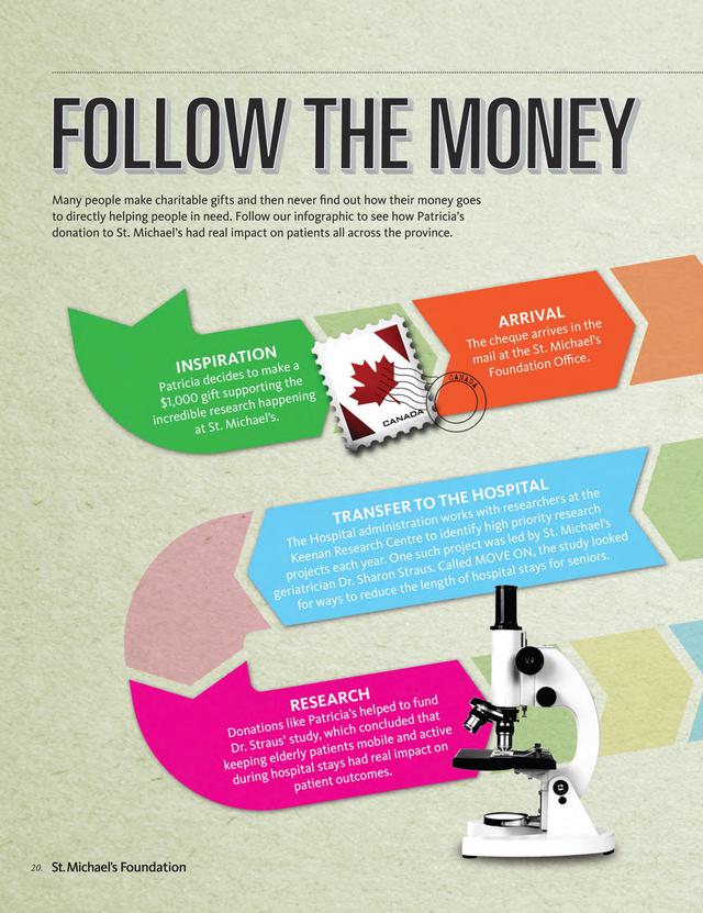 While retaining the basic elements of a hospital fundraising publication – inspiring patient stories, research breakthroughs, donor tributes and features about health and wellness, the content of the new magazine was expanded to include more ‘life-style’ features. These include recipes for healthy eating, puzzles to promote a healthy brain, book reviews and articles with broader appeal: how to have a safe vacation, local seasonal activities. We also enlisted the help of our star physicians to give our readers expert tips to staying healthy and active. Patients’ stories were presented in a more dramatic ‘photo-essay’ style in order to highlight the great work done at St Michael’s.