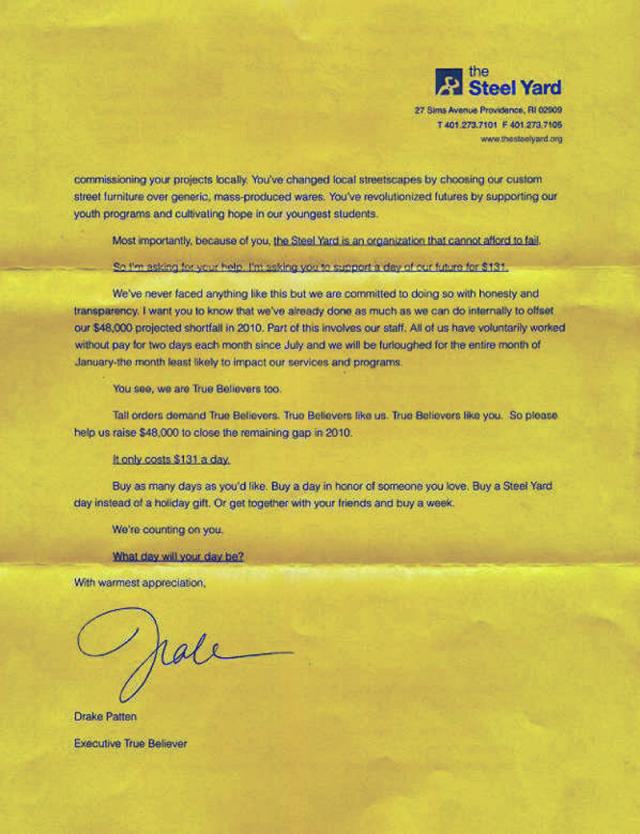 De vez em quando vemos ótimas ideias de arrecadação de fundos que podem ser facilmente adaptadas e adotadas por outras organizações sem fins lucrativos, sobretudo, pelas menores, e é um prazer compartilhá-las com vocês. Este é um exemplo que se destaca, pois mostra como uma organização pequena, de um jeito inimaginável, arrecada recursos para cobrir seus gastos gerais de funcionamento. A Steel Yard sabia que teria um saldo deficitário em 2010. Eles calcularam que o gasto seria de USD 131 por dia, então eles recorreram a um pequeno grupo de doadores que financiassem 'um dia' da Steel Yard. De um modo simples e eficaz, essa campanha de arrecadação envolveu doadores, e dentro de um mês, arrecadou US$ 35.000.