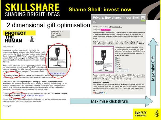 This is a really exciting exhibit. The shame Shell advert engaged both old and new supporters of Amnesty by giving them a clear role and a powerful voice throughout the campaign. It is also an excellent example of how a charity can integrate its fundraising aims and campaigning objectives into one urgent and compelling appeal.
