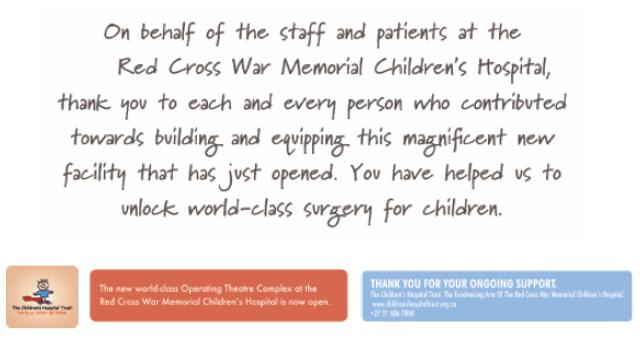 The Children's Hospital Trust reached their ambitious target of R125 million. After the completion of the initial stages of the project, donors were invited to a private function to see how their donations had made a difference. The trust then held a grand opening in September 2009, which involved a comprehensive media campaign. Donors were again invited to be involved and key stakeholders were offered the chance to be included in the media photographs and their Q&A session at the opening event.