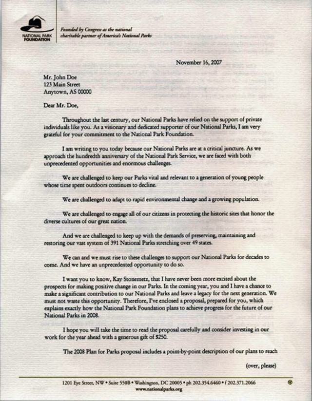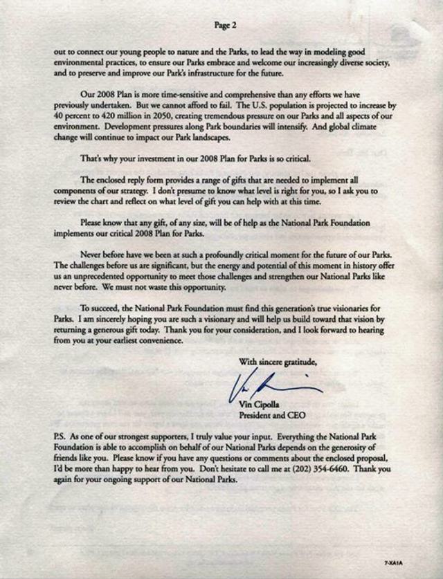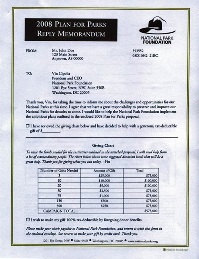 This mailing is one of Mal Warwick Associates’ signature ‘high-dollar’ appeals, employing strong production values, multiple personalisation, upscale copy, and a major donor ask. The appeal, sent to National Park Foundation donors whose previous giving indicated an ability to give more generously, incorporated a personalised ‘mini-proposal,’ mimicking the sort of materials more frequently presented to prospective major donors following a face-to-face meeting.