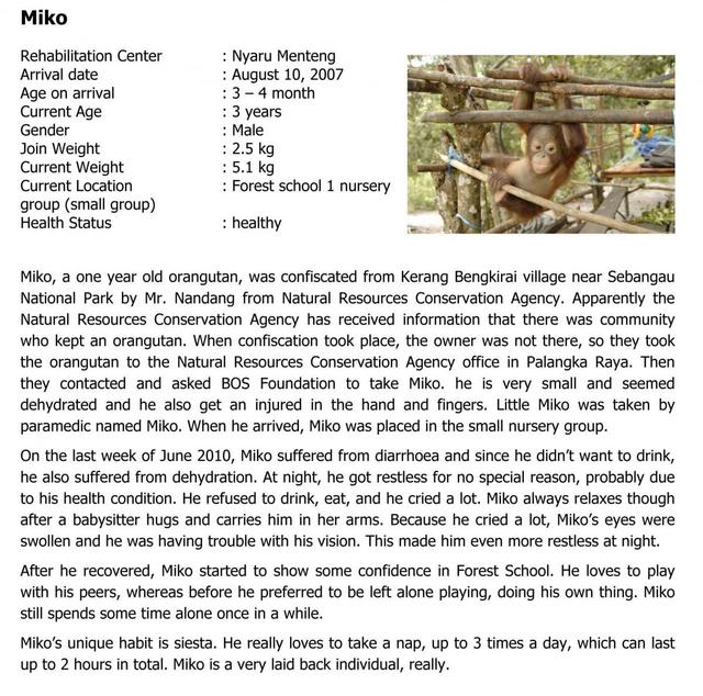 This has it all. Adorable apes being rescued from the evil plantation owners, a terrific 'adoption' programme that really captures the donors' attention, media coverage from the BBC. No wonder it is so successful. Don't you just love the photos of Miko?