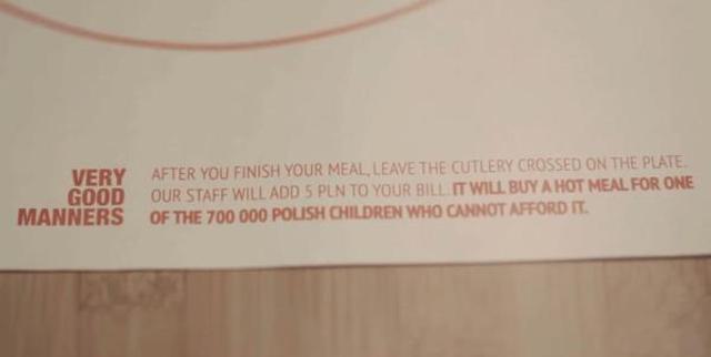 ‘Most Poles support charities only once or twice a year, it’s not we do something every day. Malnourishment among children is a social issue, thus the solution has to lie within the social fabric too. So to make people want to donate we turned donating into a rule of good conduct. And because the cause was all about food it seemed perfectly natural to focus on restaurants, which is where good manners and eating come together.'