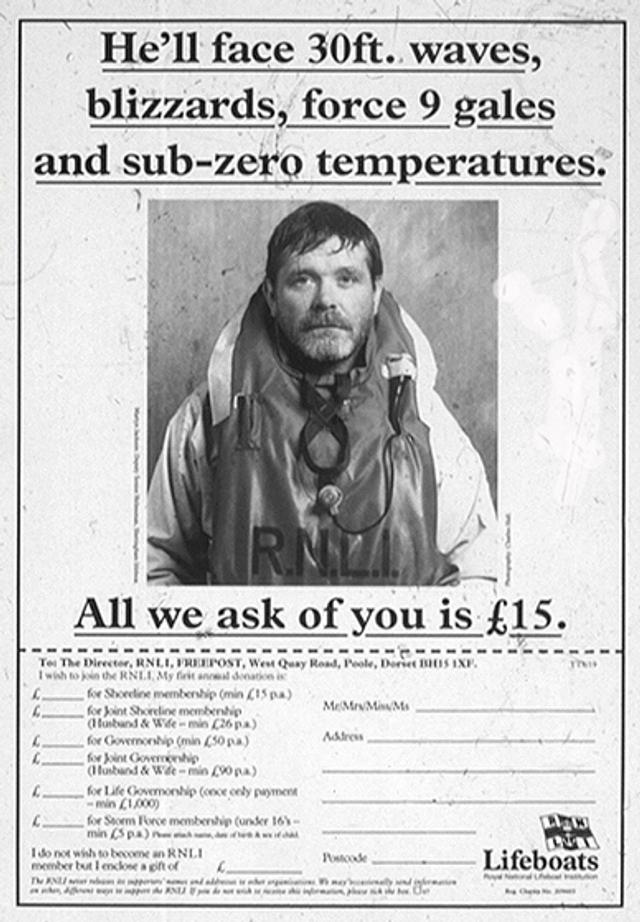Stained with the passage of time and perhaps more than a little carelessness, the face looking out at the reader from this single sheet insert has nevertheless lost nothing of its strength and power to impress. The simple direct proposition makes this one of the classic fundraising offers of all time. It has to be a bearded face. Though there are lifeboatwomen, tests prove only a rugged bearded male face will generate maximum response. And he has to look bedraggled, as if he’s just been washed in after cresting those 30 foot waves. Legend has it that in the studio, while these photographs of real lifeboatmen were being taken, unbeknown to them a wee chap with a bucket of cold water was waiting behind a screen. At a signal from the photographer he would toss the contents of his bucket over the startled coxswain. At that precise moment the photo was taken, because only then the image was right.
