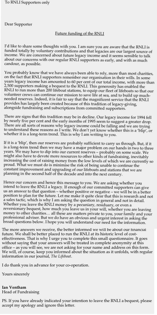 The RNLI is one of Britain’s largest voluntary (nonprofit) organisations. It depends on legacies (bequests) for a large part of its annual income, which is annually in excess of £100 million. Legacy income had dipped for a couple of years. At the time of this promotion the RNLI was concerned that the generation that had supported the charity so generously through legacies might be replaced by a generation that had neither the means nor the motivation to support in this way. It was decided that the best way to find out was to write to supporters to ask their intentions However, such an approach had never been tried before; legacy marketing then was comparatively in its infancy and was not widely accepted by many charities, let alone their supporters. The RNLI was traditionally risk averse in its fundraising and its supporters are generally older people, so the letter needed to be carefully crafted to avoid giving offence and potentially causing more harm than good.
