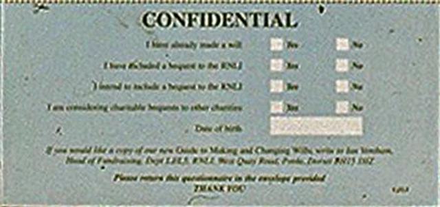 This is a classic example of a direct appeal to supporters, asking for information that will help plan for future income. The request is so clearly and honestly put, it was never going to do anything other than find favour with donors, who responded to it in droves. The copy must also have persuaded more than a few to get round to doing what they knew they should have done – include a legacy in their will to the RNLI.