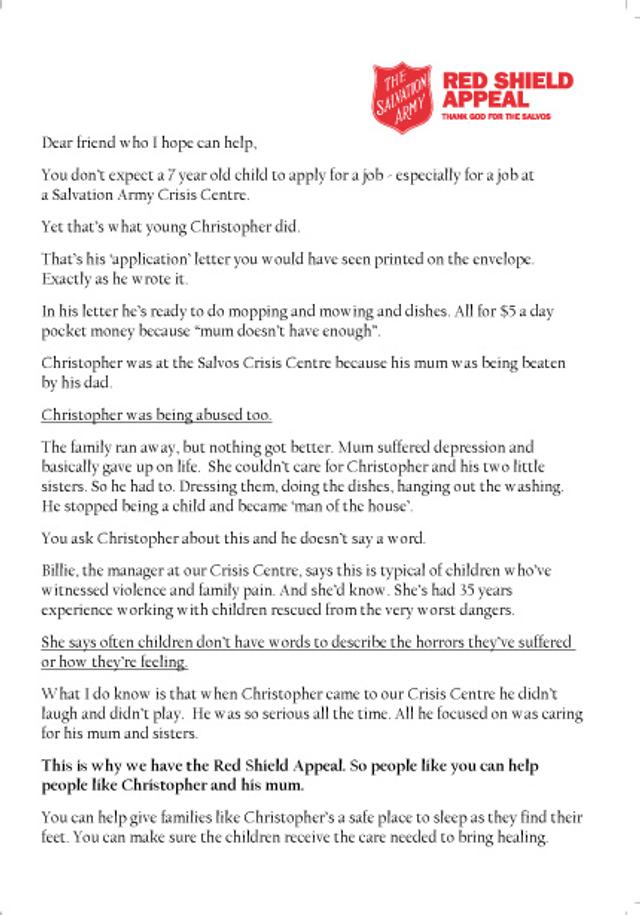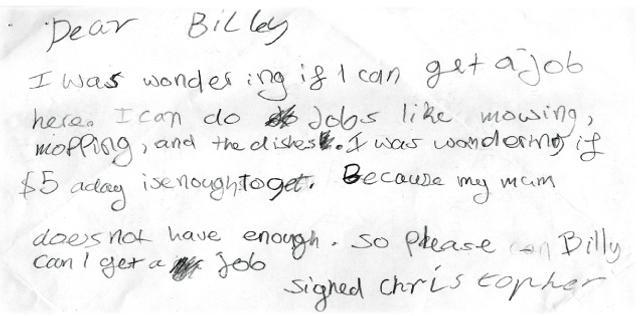 A young boy who felt sad for his mother wrote a letter on a brown paper bag to Billie, a Salvation Army support worker who had been helping the single-parent family. His letter asked if he could get a job with the Salvation Army for $5 a day so he could help his mum make ends meet – mowing, mopping and dishes were his specialty. Christopher was seven years old.
