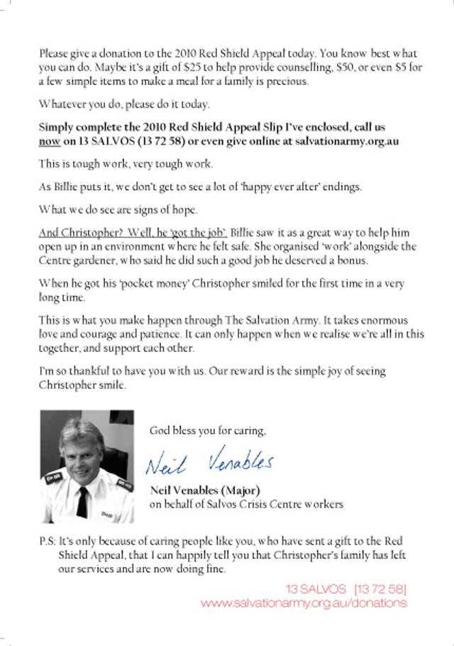 We love this, of course, because once again it proves that if you have a good story and you tell it well people will reach into their pockets to help you. But we especially like this story because the Salvation Army in Australia has built such a strong team throughout the whole organisation that the support worker who received Christopher's letter went straight to the fundraisers to show it to them and to tell the story of Christopher and his family. Of course, being the good fundraisers that they are, they jumped at the chance to use it.