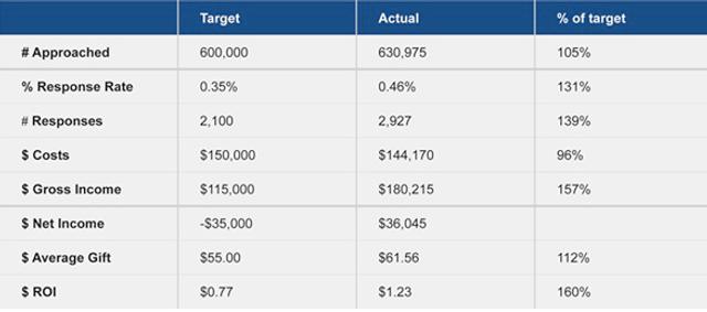 We used lower than usual acquisition dollar handles ($50, $25 and $5) to get a maximum number of new donors with a view to upgrading the giving levels later through an existing new donor strategy.