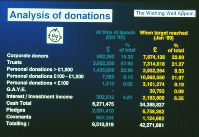 A general rule of thumb is that it is seen as respectable for big gift fundraising to have a cost-to-income ratio of about 10 per cent, whilst public phase fundraising is much more expensive – nearer 25 to 30 per cent. Because of the massive public response, the Wishing Well Appeal was able to keep its costs to approximately two per cent of the funds raised.