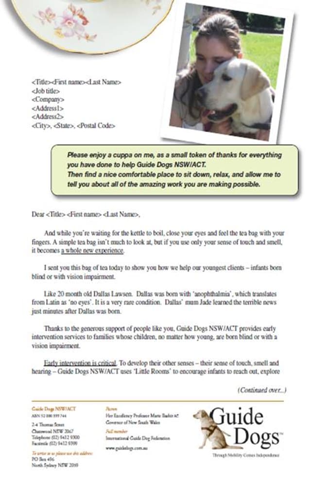 Guide Dogs Australia si appresta a preparare l’appello di agosto. Questa volta però il messaggio ha come obiettivo qualcosa di diverso: raccontare ai donatori i programmi di mobilità e orientamento dedicati ai bambini non vedenti. Nonostante l’argomento sia molto interessante, la creazione dell’appello risulta questa volta più complessa: i cani guida non vengono assegnati a bambini e neonati perché’ troppo piccoli. Se da un lato i cani guida non possono essere i protagonisti di questo messaggio, dall’altro vi è la necessità di inserirli il più possibile all’interno del mailing, per evitare una caduta consistente nel tasso di risposta. Alla fine è bastata una semplice trovata per superare l’impasse: una bustina di tè alla menta.