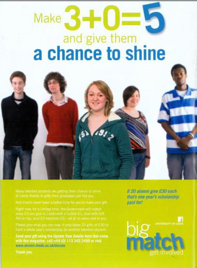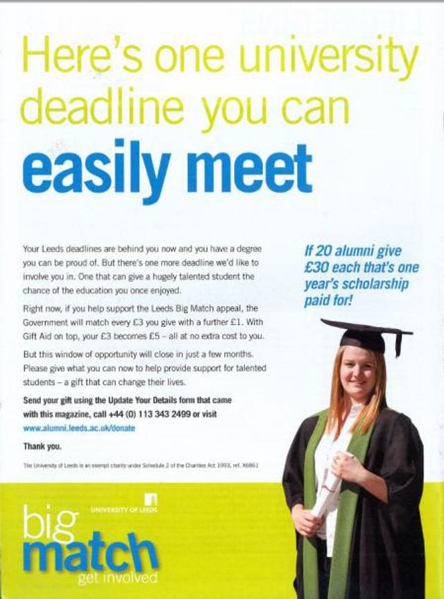 However, the University also sends an alumni magazine, Leeds, to its entire alumni base worldwide, twice a year. The alumni and development team decided to test whether a full-page advert on the back of the magazine, supported by donation options in the ‘update your details’ form enclosed with the magazine, could generate comparable returns to a ‘stand-alone’ direct mail appeal. This meant it was at a much lower cost, as all the print and postage for the magazine was covered anyway.