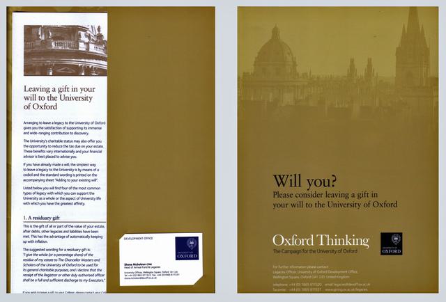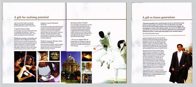 The University of Oxford launched an ambitious £1.25 billion campaign in May 2008 with the purpose of perpetually increasing the level of giving through engagement with alumni and friends. This legacy brochure is the first in over 10 years and is collegiate in nature, in other words, it encourages giving across the University – colleges, departments, museums, libraries and other areas within Oxford University. It is personalised by area through an insert template, which can be customised to suit a college, department, or an area such as student support. All of the technical wording and other legal issues are included on inserts that fit into the back of the folder. This provides greater flexibility, especially if there are changes to legal or tax wording. The opening message is from the Chancellor, Lord Patten, who is well-known and respected by alumni and friends. It is designed as a response to enquiries and as a leave-behind for both college and University development staff in their visits with potential legators.