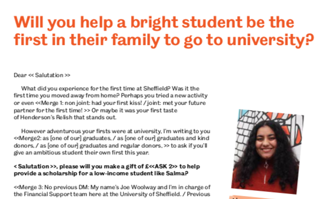 The University of Sheffield has been sending alumni direct mail in order to raise money for student scholarships every year since 2017. With a limited budget, the University of Sheffield currently produces all direct mail in-house (using a local agency for design, print and fulfilment). Income from direct mail had grown but in order to grow it further in 2019, whilst still being cost-effective, Sheffield needed to try a different approach. Advised by Adrian Salmon from GG+A consultancy, it was recommended that Sheffield try a longer letter as part of the mail pack.